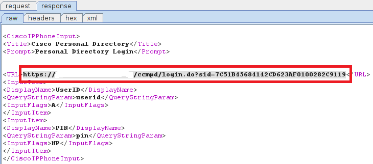 The response contains a reference to the login.do page along with a "sid" token, which is used in the subsequent requests, as shown in the response below: