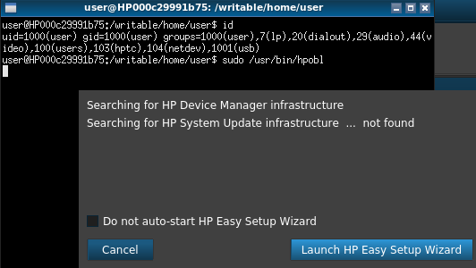 ReplyDeleteyou can directly do && /usr/bin/hpobl and then get to HP Easy Setup Wizard directly... ;-) I did that way in the video to show the priv escalation process ;-)