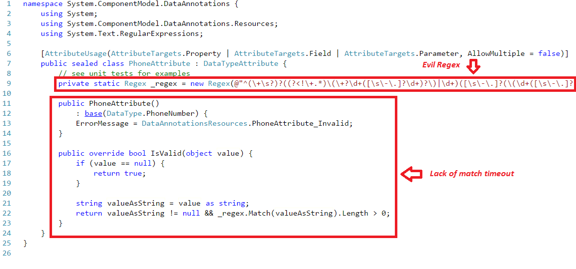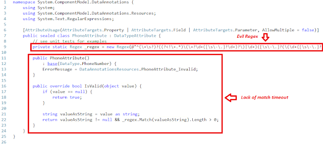 In .NET Framework (4.5), “evil” regular expressions are used by default in three classes (EmailAddressAttribute, PhoneAttribute, UrlAttribute) which are part of System.CompontentModel.DataAnnotations .NET library.